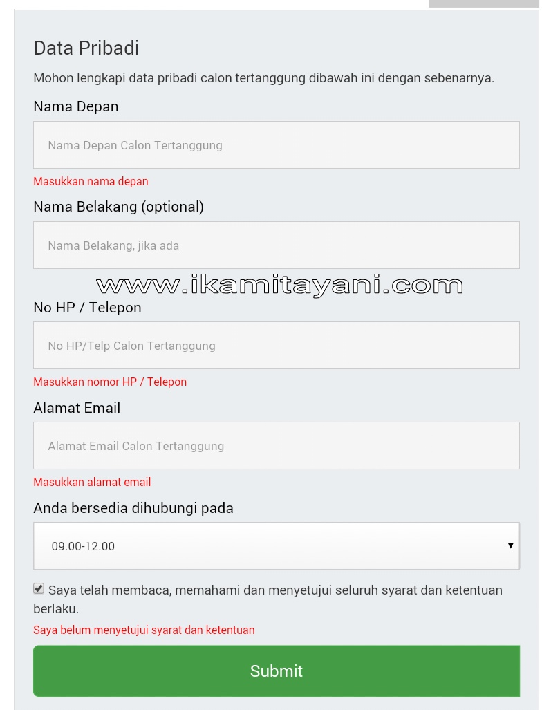 Isi form tersebut dengan lengkap dan benar agar tidak terjadi kegagalan pembelian polis atau penolakan klaim di masa datang, lalu submit. Sebaiknya baca terlebih dahulu syarat dan ketentuan yang ada. Kalau Anda setuju, ya submit saja. Setelah itu Asuransi Motor Terbaik akan menjadi perantara Anda dengan Perusahaan Asuransi yang telah Anda tunjuk. Oia, polis dan pertanggungan akan berlaku setelah pihak asuransi berhasil memproses pembayaran Anda. Anda akan dihubungi oleh pihak asuransi sesuai kesepakatan yang sudah Anda pilih di Data Pribadi, jadi jangan sampai terkejut ya. 🙂