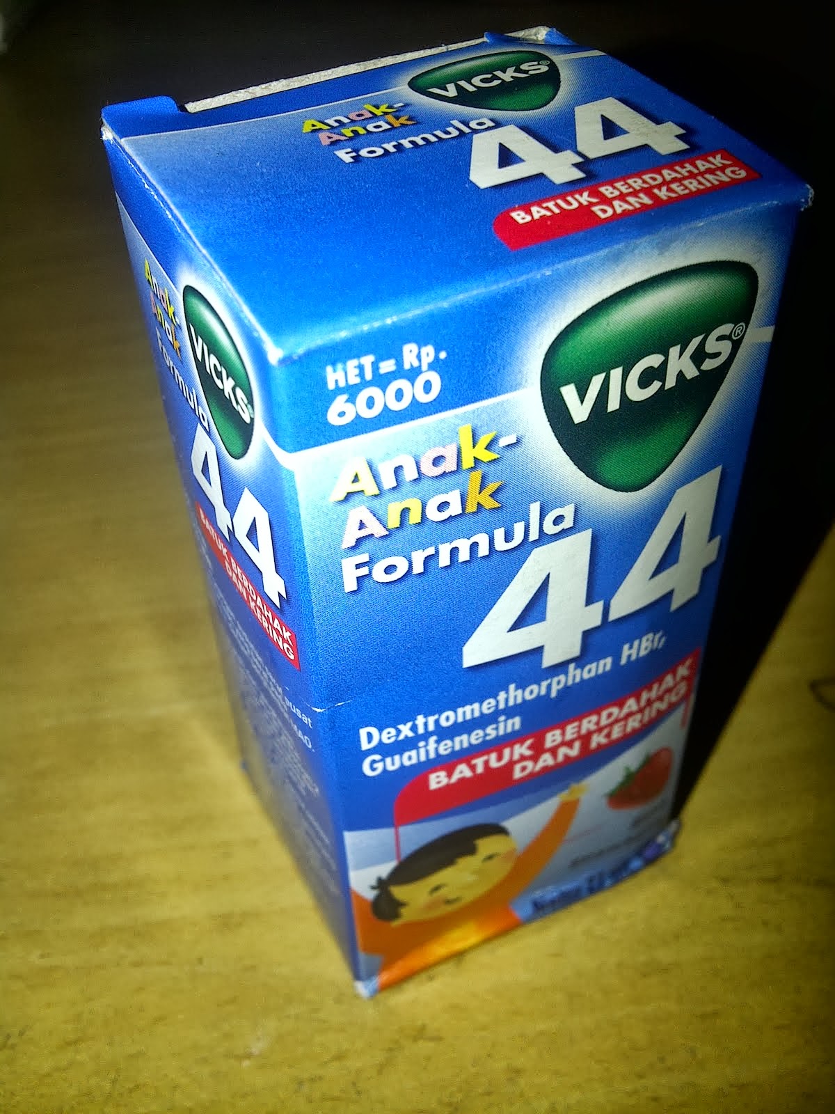 Vicks Formula 44, Batuk berdahak dan kering, rasa Strawberry anak-anak biasanya menyukai. Harganya juga murah, untuk harga yang disarankan adalah Rp 6.000,-. Terkadang di beberapa tempat, ada yang menjual di bawah harga tersebut.