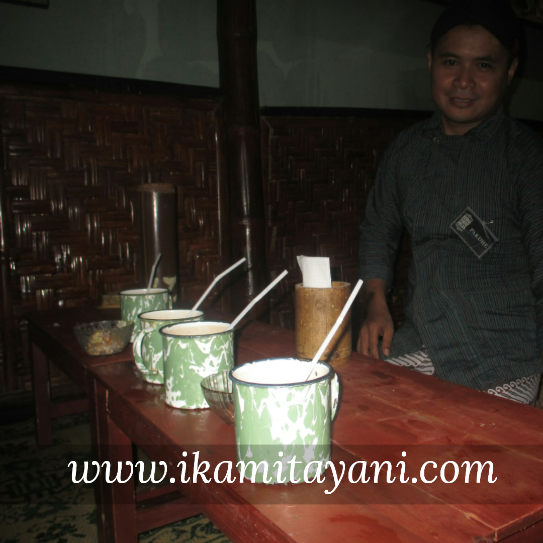 Apa sih yang saya suka? Saya seperti kembali ke masa kecil, dimana eyang saya tinggal di pedesaan yang asri dan teduh. Peralatan makannya benar-benar yang biasa dipakai di desa jaman dulu. Piringnya seperti yang ada di gambar.  Cangkir tehnya juga yang saya suka. Aksen lurik itu lho. Saya juga memilikinya di rumah, sambil membayangkan diri saya juragan batik. Haha….